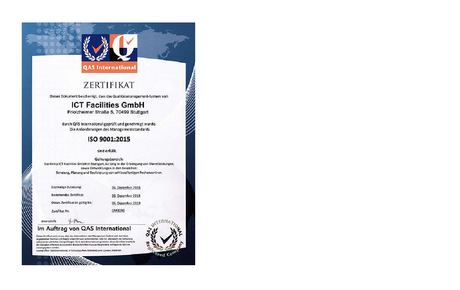 Wir sind zertifiziert für die Einführung und Anwendung eines Qualitätsmanagementsystems nach DIN EN ISO 9001:2015 für die Geltungsbereiche Erbringung von Dienstleistungen sowie Entwicklungen in den Bereichen Beratung, Planung und Realisierung von schlüsselfertigen Rechenzentren.